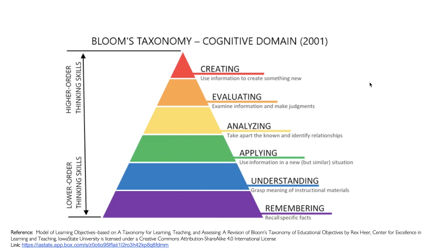 Because AI offers its biggest shortcut when assignments reward recall or polished summaries, this framework is useful for designing TBL AEs that push students into higher-order thinking: applying concepts, analyzing trade-offs, evaluating alternatives, and creating or adapting solutions.